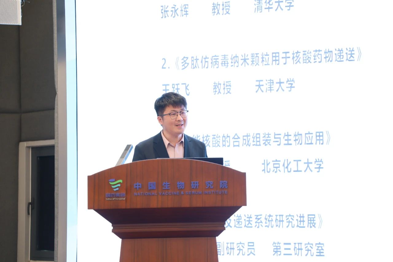 王跃飞副教授是天津大学化学工程研究所副所长、副研究员,长期致力于新型核酸递送载体的开发及应用。王教授以“多肽仿病毒纳米颗粒用于核酸药物递送”为题,全面分享了其在多肽载体的设计和应用方面的成果,介绍了多肽仿病毒纳米颗粒(PVLP)作为一种新型核酸药物递送工具的优势。他特别强调PVLP在mRNA疫苗中的应用潜力,分享了团队关于PVLP配方的高通量筛选过程以及活性评价的最新成果,为探索新型mRNA疫苗递送系统提供了新的借鉴。