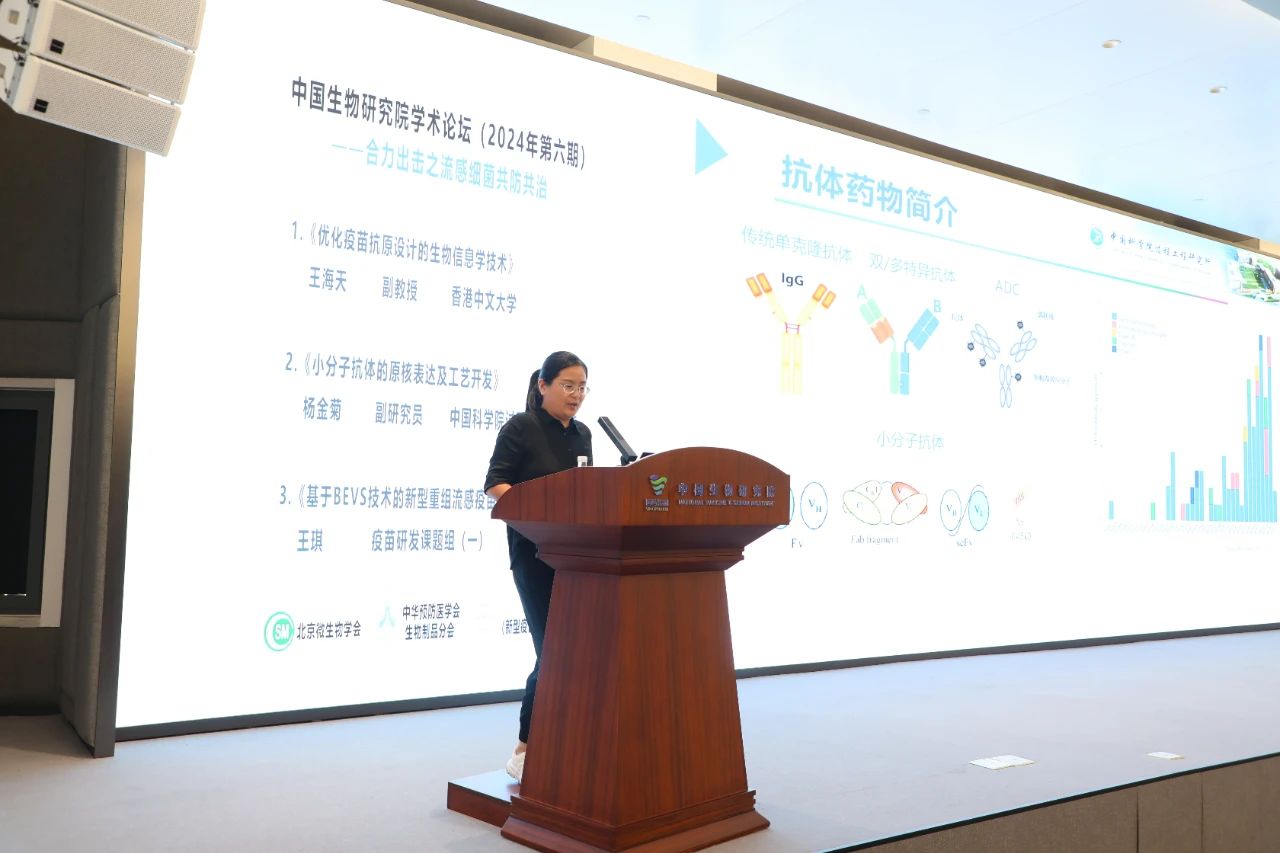 杨金菊研究员长期深耕于生物技术和抗体药物领域,积累了丰富的研究与应用开发经验,负责参与的生物技术药物已有2项进入临床研究,2项正在进行IND申请。杨老师以“小分子抗体的原核表达及工艺开发”为题,进行了全面而深入的技术分享,通过创新性地优化原核表达策略和工艺开发流程,高效提升小分子抗体的表达量和纯度,进而有效控制了生产成本,推动其在医药、诊断、生物技术和农业等领域的广泛应用。
