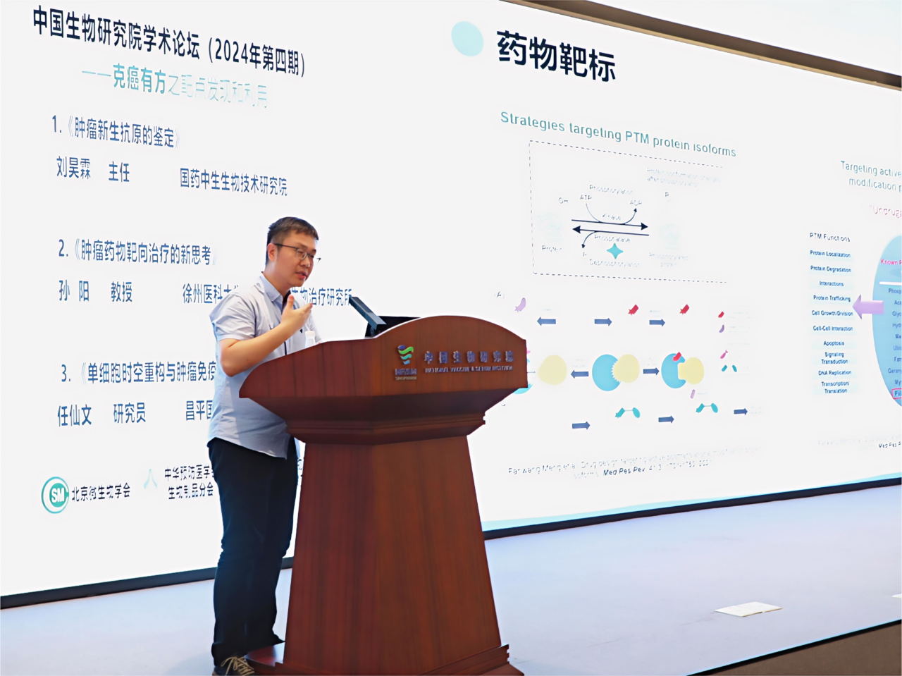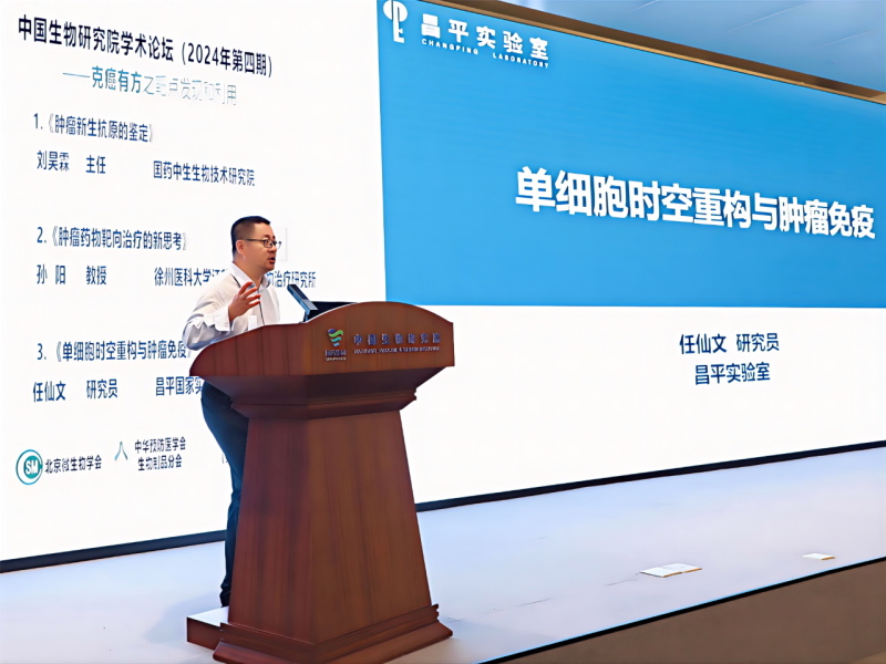 2024年7月,中国生物研究院(新型疫苗国家工程研究中心)免疫治疗中心举办主题为“克癌有方之靶点发现和利用”的学术论坛。此次论坛邀请了免疫治疗研究领域的三位杰出专家学者分享了最新研究成果。来自徐州医科大学江苏省肿瘤生物治疗研究所的孙阳教授作题为“肿瘤药物靶向治疗的新思考”的学术报告,深入探讨了肿瘤药物新靶点的发现与验证;来自昌平国家实验室的任仙文研究员,以“单细胞时空重构与肿瘤免疫”为主题,介绍了团队应用生物信息学和计算生物学解析肿瘤相关分子靶标及潜在作用机制方面的进展;特邀来自北京大学肿瘤医院的沈琳教授,以三十余年丰富的临床实战经验,全面且深入地梳理了细胞治疗临床研究的国内外前沿进展、面临的挑战以及取得的突破,并分享了多个肿瘤新药临床研发实例,为参会人员提供了宝贵的经验和启示。研究院免疫治疗中心刘昊霖、范盈盈作学术报告,与与会专家们分享讨论了研究院在肿瘤靶点发现与筛选以及CAR-T细胞治疗方面的阶段性进展。