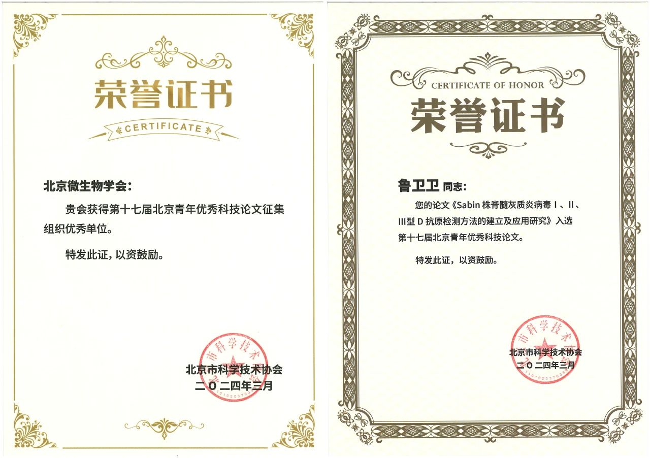 近日,北京微生物学会在北京市科学技术协会主办的“第十七届北京青年优秀科技论文”征集活动中,荣获优秀组织单位奖。国药中生生物技术研究院(新型疫苗国家工程研究中心)作为北京微生物学会的支撑单位,为这次论文征集活动提供了大力支持。同时由中国生物研究院推荐,第二研究室副研究员鲁卫卫发表的论文《Sabin株脊髓灰质炎病毒Ⅰ、Ⅱ、Ⅲ型D抗原检测方法的建立及应用研究》,入选“第十七届北京青年优秀科技论文”。