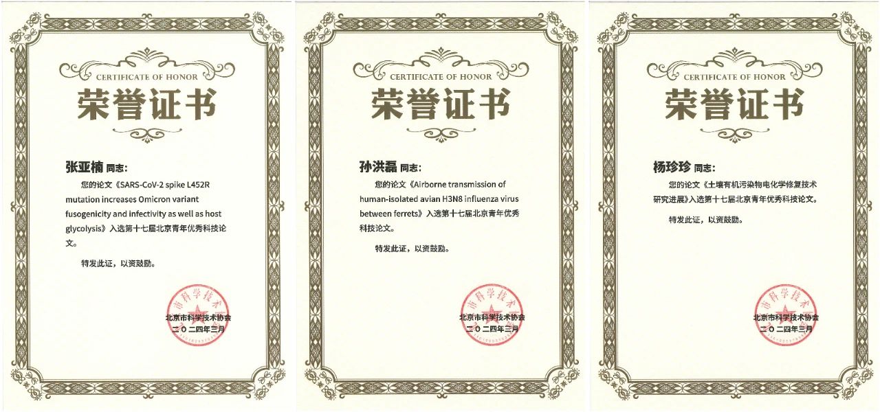 “北京青年优秀科技论文”评选活动每两年举办一次,应征论文为45周岁以下在北京地区从事科研工作的青年人才公开发表的高水平学术论文。本次学术论文征集中,北京微生物学会支撑单位中国生物研究院发起广泛宣传,积极鼓励青年科技工作者踊跃参与,共计接收到科技论文69篇。经过学会理事会的审慎筛选与严格评审,最终遴选12篇科技论文推荐至北京市科协。最终,4篇论文(含2篇中文、2篇英文)脱颖而出,荣获“第十七届北京青年优秀科技论文”的殊荣。